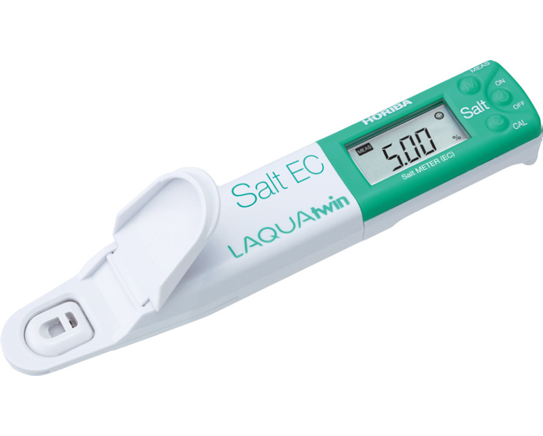 Mit dem LAQUAtwin Salt-11 Taschenmessgerät können Sie den Salzgehalt in verpackten oder verarbeiteten Lebensmitteln, wie z.B. Chilisaucen, schnell, einfach und bequem messen. Dieses wasserdichte Taschenmessgerät misst den Leitfähigkeitswert einer Probe und wandelt ihn mit der ausgewählten Kalibrierkurve für Meerwasser oder Natriumchlorid (NaCl) im Messgerät in einen Salzgehalt um. Der Messwert auf dem hintergrundbeleuchteten LCD kann in Prozent (%) oder Teilen pro Tausend (ppt) angegeben werden. Der austauschbare Sensor ist mit einer kleinen Probenvertiefung ausgestattet, in die zwei mit Platin beschichtete Titanmetallelektroden eingebettet sind. Dieser einzigartige Sensor kann Proben im Mikrobereich von nur 0,12 ml aufnehmen und messen.