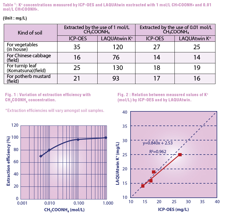 - Messen Sie die Kaliumionenkonzentration der filtrierten Lösung mit kalibriertem B-731 und mit ICP-OES (z.B. HORIBA Jobin Yvon. Modell ULTIMA2).
