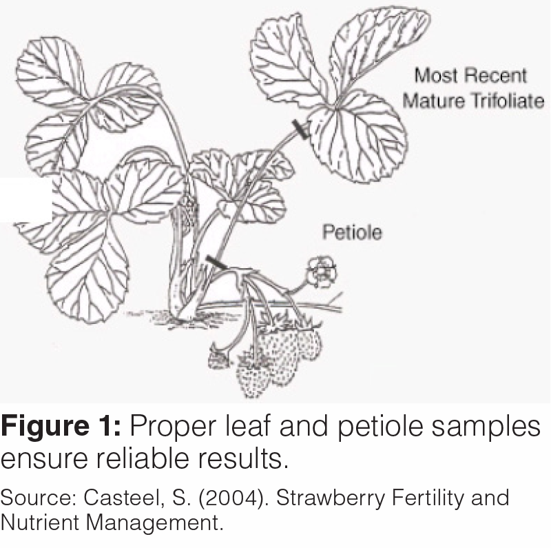 1. Sammeln Sie die 2 jüngsten reifen dreiblättrigen Blätter und die dazugehörigen Blattstiele von 20 verschiedenen Erdbeerpflanzen, um eine repräsentative Probe zu erhalten. Der Blattstiel muss von der Pflanze in der Nähe der Krone abgetrennt sein.