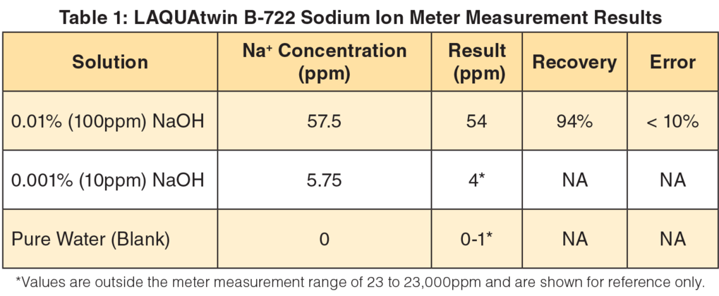 Die Reinigungsvalidierung ist ein wichtiger Bestandteil der aktuellen guten Herstellungspraxis, um sicherzustellen, dass Produktionsmaterialien, die mit den Oberflächen der Geräte in Berührung kommen, nicht kontaminiert werden. Die Vorspülung, der Laugenumlauf und andere Schritte müssen in der richtigen Reihenfolge erfolgen. Die Identität, Reinheit und Stärke der Reinigungschemikalien und die Qualität des für die Spülung verwendeten Wassers müssen überprüft werden. Außerdem muss das Validierungsprotokoll Tests für die Rückstände der Reinigungschemikalien enthalten, um sicherzustellen, dass die verwendeten Chemikalien ordnungsgemäß entfernt werden. Die Analyse muss quantitativ sein und die Akzeptanzkriterien werden gemäß den gesetzlichen Richtlinien und der Unternehmenspolitik festgelegt. Die obige Tabelle zeigt die Messergebnisse des LAQUAtwin B-722 Natriumionenmessgeräts.
